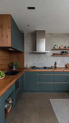 This kitchen looks so cool, it probably comes with a built-in robot that does your homework while you grab a snack (wishful thinking, right?). Those deep green cabinets paired with the warm wood countertops are seriously stylish – it’s like nature decided to get a futuristic makeover. Everything is so clean and smooth, you might feel pressured to actually keep it that way, which is harder than it looks after attempting to make anything more complicated than cereal. It’s the kind of modern design that makes your kitchen feel less like a chore zone and more like the coolest room in the house.