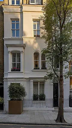 Walking up to this place, you’re greeted by a path lined with perfectly trimmed bushes and a front door that looks super inviting, especially with the warm light spilling out. Those balconies aren’t just for show; they’re like mini-gardens hanging in the air, probably giving all the other city houses serious plant envy. It’s definitely the kind of London house where you could kick back, watch the world go by from your very own green-filled perch, and maybe even get away with having a pizza party without anyone noticing because you’re so tucked away in your chic, white wonderland.