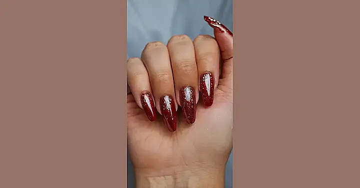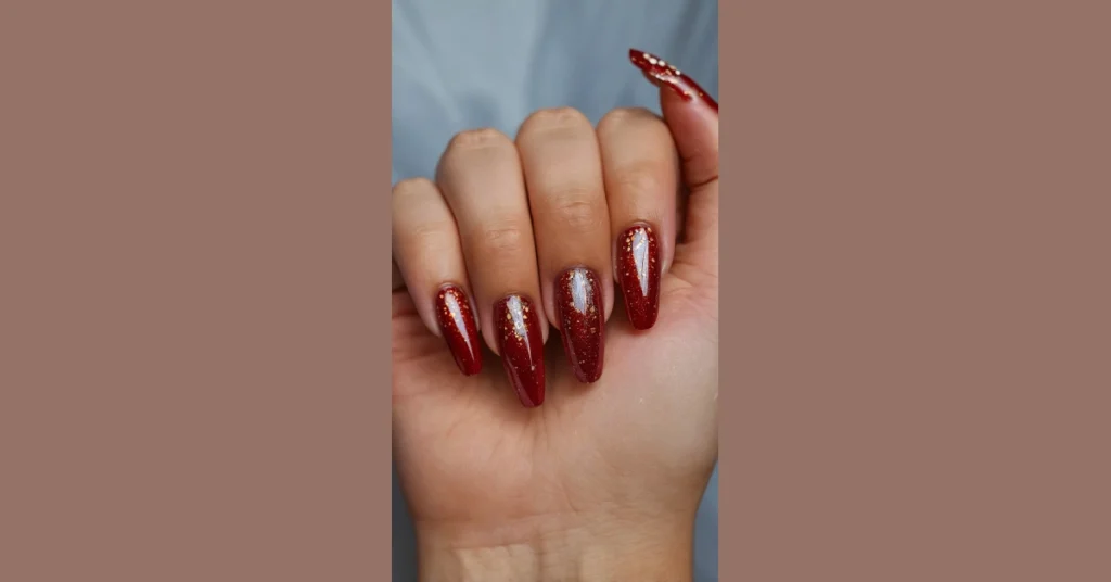 Get ready to turn heads with these incredible red nail designs that are anything but basic! These aren’t just red nails; they’re like tiny, glittering party hats for your fingertips, ready to add some serious dazzle to your day. That deep, rich crimson base combined with a generous sprinkle of gold fairy dust means your hands will be sparkling brighter than a disco ball at the school dance. Just try not to blind anyone with all that gorgeous glint when you’re showing off your latest TikTok moves!