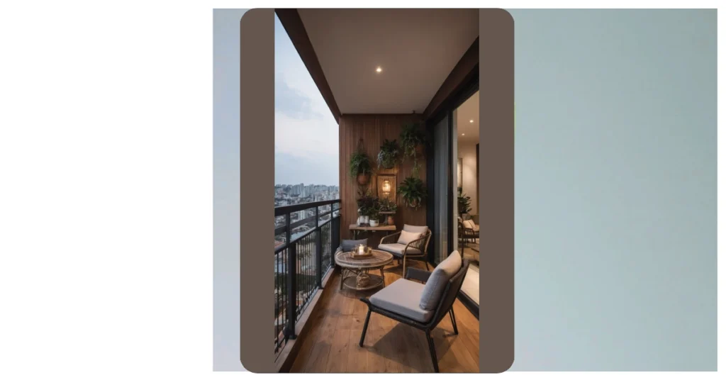 Notice how every detail in this amazing balcony design screams “come hang out!” The warm lighting makes those plants glow, turning the whole wall into a living piece of art – way better than a plain brick wall, right? And that wooden floor? So much nicer than cold concrete, perfect for bare feet after a long day of, you know, being awesome. Plus, with that amazing city view, you’d be queen or king of the skyline. Who needs a fancy café when your own balcony could be this epic? It’s proof that with a little creativity, even a small outdoor space can become the ultimate chill-out zone, perfect for everything from homework (maybe) to just soaking up some fresh air.