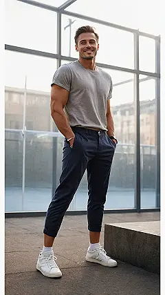 Forget trying too hard or worrying about complicated layers; this look is all about smart casual done right. Notice how those pants are perfectly cuffed, showing off just enough ankle to let his crisp white sneakers truly pop? It’s a small detail, but it instantly turns a simple t-shirt and pants combo into something ready for anything. Whether he’s off to grab some pizza or just hanging out, this men’s pants outfit shows you don’t need a fancy wardrobe to look sharp and feel like a total boss.