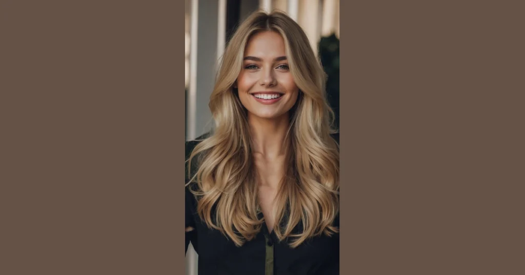 That subtle little smile she’s rocking totally matches her hair’s relaxed, friendly vibe, as if she knows her blended locks are having the best of both worlds. This hair isn’t just one boring color; it’s a whole adventure of tones, making her look both chic and super approachable. It’s the kind of look that makes you think she could be rocking out at a concert one minute and then chilling with a good book the next, all thanks to that perfectly balanced blonde-brown glow.