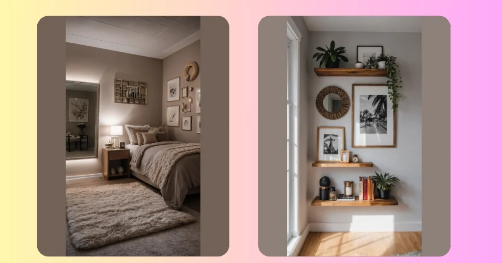 But wait, there’s more wall magic happening! Those sleek floating shelves in the corner aren’t just for show; they’re like tiny stages for your favorite photos, candles (hello, mood lighting!), and that cool metallic vase that might secretly be a rocket ship. Plus, peek at that edgy mask art and the abstract piece – they add a serious dose of cool without trying too hard. It’s proof that bedroom wall decor can be both fun and functional, turning a plain space into a personalized haven where every glance brings a smile (or a little chuckle at how much personality your walls have!). Just be careful not to knock over any candles when you’re dramatically practicing your dance moves!