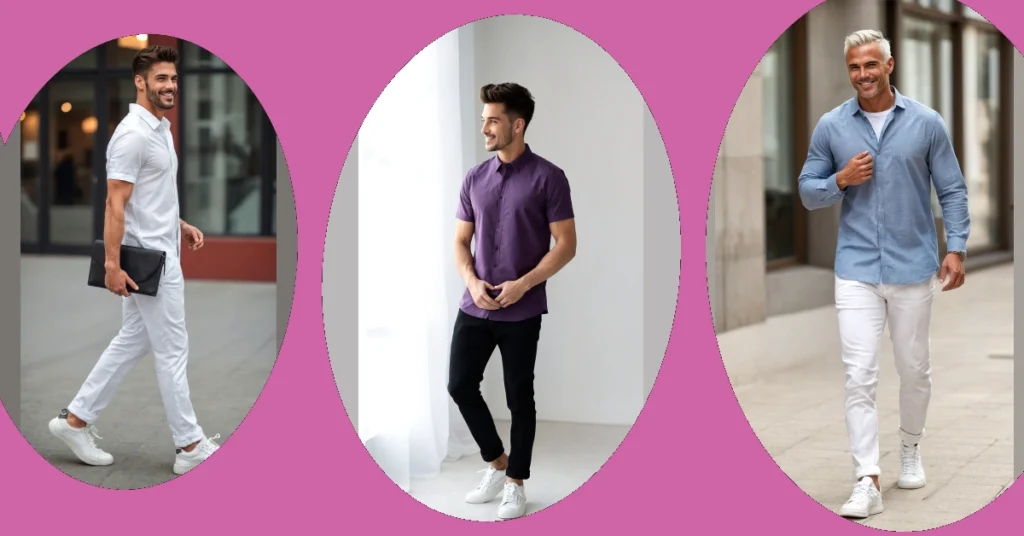 Now, for the real daring move: those absolutely spotless white pants and sneakers! Most of us would be walking around in a permanent state of panic, dodging every splash, crumb, and suspicious-looking bench. He’s either got some serious magic stain repellent, or he just lives life on the edge, one pristine white step at a time. This shirt outfit proves that confidence (and maybe a secret stash of wet wipes) can make even the riskiest fashion choices look absolutely amazing. It’s a reminder that sometimes, just putting on a great shirt and owning it is all you need to conquer the day – and probably avoid any rogue spaghetti sauce.