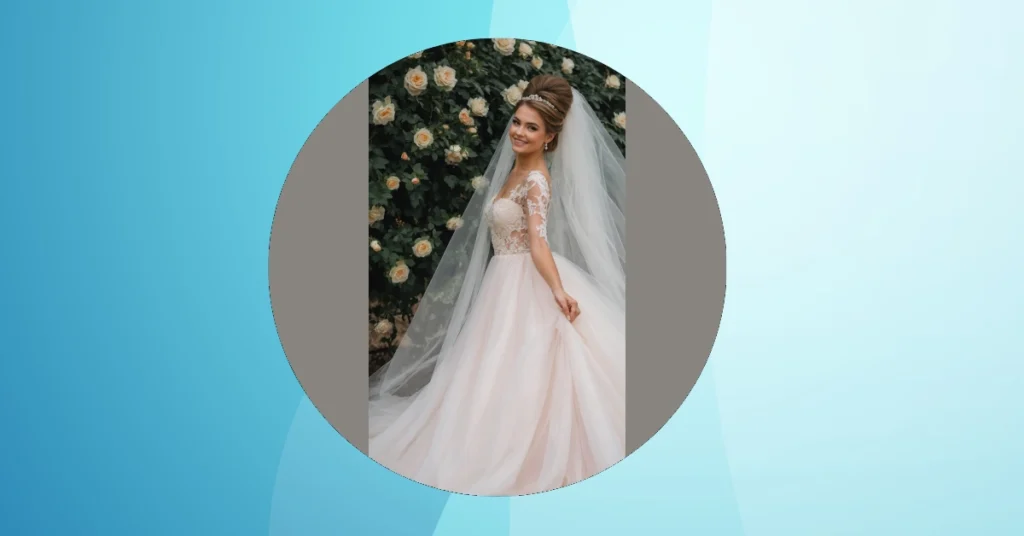 Look at this amazing bride, practically glowing in her gorgeous gown! That smile could light up a whole forest, and honestly, her dress is so dreamy with all that delicate lace. You might think it’s just a classic white, but zoom in a little and you’ll notice a subtle, lovely blush tone peeking through. It’s like the dress itself is winking at tradition, saying, “Hey, white is cool, but a little color can be even cooler!” This subtle hint of pink makes you wonder, why stick to just one color when your personality shines in so many?