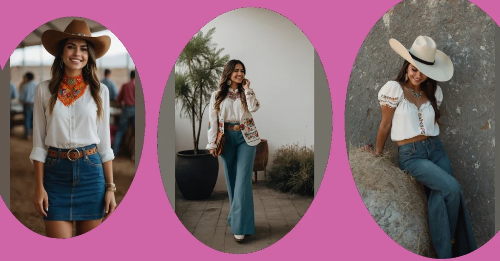 Those wide-leg jeans look so comfortable, you could probably do a TikTok dance-off or even, dare we say, actually ride a horse (a really chill one, though!) without feeling restricted. Paired with those sharp boots and that stunning necklace, this look perfectly blends traditional charm with modern-day coolness. It’s the kind of outfit that says, “I’m ready for adventure, but also ready for a selfie,” making it a perfect example of how awesome Mexican rancho outfits can be for anyone who loves fashion with a friendly, vibrant twist.