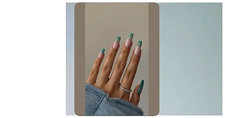 But wait, there’s more! The way some nails rock that nude base with a sharp, angled green tip is pure genius, like a secret nod to high fashion. And peep that tiny gold detail on one nail – is it a tiny deer, a fancy leaf, or just a chic abstract doodle? Whatever it is, combined with those sparkly rings and snuggled up in a fluffy white sweater, these nails aren’t just green; they’re a whole vibe. They’re practically daring you to try something new and exciting, all while keeping your hands cozy and looking ridiculously cool.