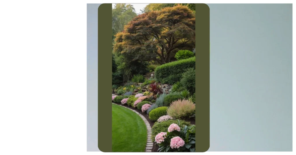 Look beyond that perfectly stripey lawn and you’ll see a whole world of plant party happening on those stone steps! It’s like a VIP section for bushes, with vibrant reds and greens creating layers that are way more interesting than my latest TikTok feed. You can almost hear the soft rustle of leaves inviting you up to explore what new, cool plant is hiding just around the corner. This ‘dreamy home garden’ isn’t just about pretty flowers; it’s a full-on landscape adventure, probably designed by someone who secretly wanted to be an architect but loved plants more. Just imagine trying to mow that upper section – talk about a workout, or maybe that’s why it looks so perfect, no one dares to disturb its leafy serenity!