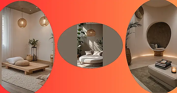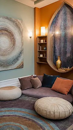 Seriously, ditch the stress and soak in the vibes of this room. The warm, earthy colors feel like a giant, calming breath, and that cool swirly art on the wall looks like it could actually pull your worries right out of your head. Add in the soft lighting, and you’ve got a perfect sanctuary for when you just need to zone out, maybe listen to some tunes, or just stare at that shiny gold vase and contemplate the meaning of life (or just what’s for dinner). This is the kind of space that reminds you it’s okay to just relax and hit the reset button.