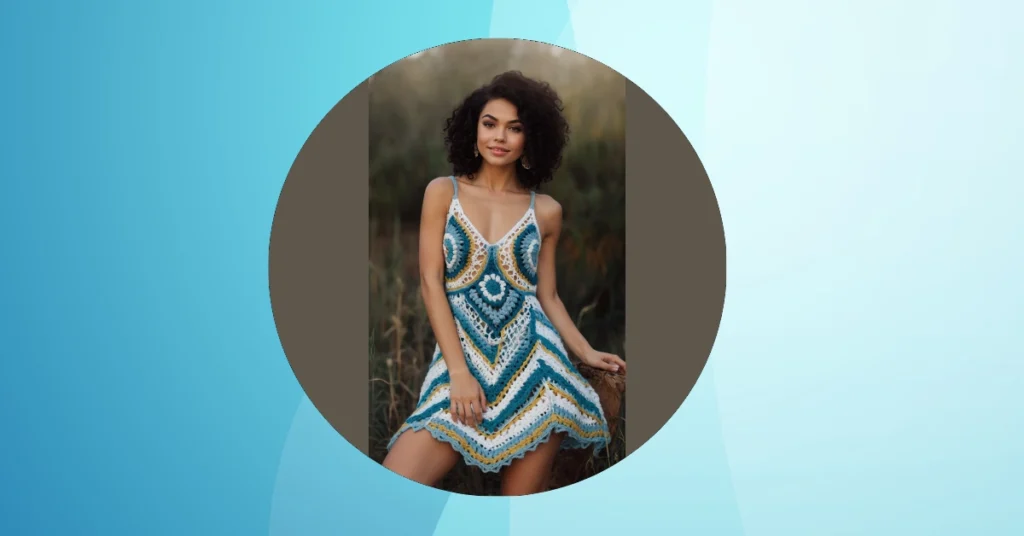 And check out the rockstar wearing it! That smile practically screams, “Yes, I know this dress is fabulous, and yes, I’m having the best day ever!” The light blue wrap just floats along with her, adding a touch of airy elegance, almost like she’s about to gently float away on a cloud of coolness. It shows that you don’t need a wizard’s spell to look amazing; sometimes, all it takes is a stunning crochet-inspired dress that’s as unique and joyful as you are, ready to turn heads at any fancy gathering (or just when you’re grabbing a smoothie!).