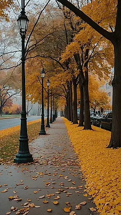 And those cool old street lamps? They’re basically acting like spotlights on a stage where the main act is Mother Nature showing off her best fall fashion. With the mist hanging around in the background, it’s got this super chill, slightly mysterious vibe that makes you want to grab a warm drink and just wander until you discover something awesome. Forget endless scrolling for the perfect background; this scene is basically a ready-made mood-booster for your phone or computer, proving that sometimes, the best digital art is just the real world doing its thing.