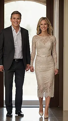 Getting ready for a wedding is a whole adventure, especially if you’re a parent of the happy couple! You want to look fantastic, but definitely not so fantastic that you get mistaken for the bride – that’s a unique kind of funny awkwardness. The woman in this picture totally crushes the ‘wedding mom dress’ vibe. Her elegant lace number is just right, showing off some serious style without trying to upstage anyone. It’s like she’s saying, ‘I’m here to celebrate, look fabulous, and maybe snag an extra piece of cake without causing a scene!’