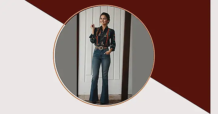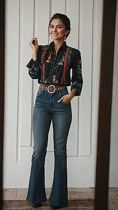 Those flared jeans are giving off major throwback cool, perfect for kicking up some dust on the rancho or just, you know, strutting down the hallway like you own the place. She’s smiling like she just found out her horse can make coffee, or maybe she just loves how comfy yet totally put-together this look is. This outfit proves you don’t need a lasso to look amazing – just some awesome embroidery, a killer belt, and a smile that says, “Yep, I’m this fabulous!”