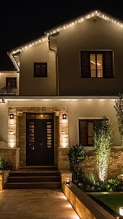The house in this picture looks like it’s ready to host the coolest December party or at least win the neighborhood light-decorating contest, hands down! Those sparkling lights on the tall trees aren’t just pretty; they’re practically screaming, “Welcome, brave souls, to our cozy abode where hot cocoa flows freely!” With all those fancy outdoor lanterns and the clever little pathway lights, you definitely wouldn’t trip on your way to the door, even if you were trying to sneak back in after curfew. It’s the kind of entrance that makes even the grumpiest grinch crack a tiny smile and maybe even wonder if they left their own porch light on.