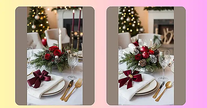 This entire setup, from the twinkling Christmas tree in the background to the warm glow spilling from the fireplace, just screams ‘holiday magic.’ It’s the kind of place where you gather with your favorite people, ready to laugh, share stories, and probably eat way too much of everything. With a centerpiece this stunning, you almost forget to look at your phone! Just make sure Uncle Bob doesn’t get too enthusiastic telling his famous fishing story and accidentally knocks over a candle with a dramatic hand gesture. We want a festive glow, not a five-alarm holiday light show!
