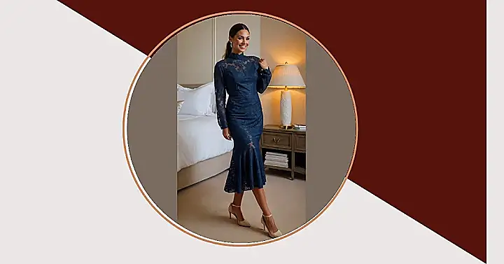 Finding the perfect wedding guest outfit can feel like a mission, especially when you want to look super chic but also avoid accidentally matching the bridesmaids. Good news: this stunning navy lace dress hits all the right notes! The high neck and flowy sleeves give it a classy vibe, while the pretty lace detail adds just enough flair to make you stand out without, you know, stealing the show from the bride. It’s the kind of dress that says, “I put effort into this, but I’m also here to have fun and maybe sneak an extra piece of cake.”