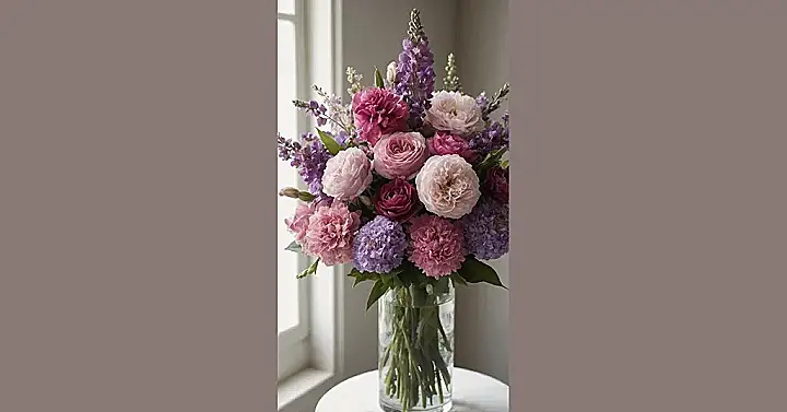 This flower arrangement is basically a fancy party for petals, and everyone’s invited! Just check out this fabulous group hanging out in one vase – you’ve got the superstar roses, all soft pink and bursting with layers, mingling with the tall, elegant purple spires that seem to be stretching for a selfie. Down below, the smaller, frilly purple and pink blossoms look like they’re giggling at the bottom, making sure the whole crew is rocking the most vibrant shades. It’s a botanical bash, and these flowers are clearly having a blast.
