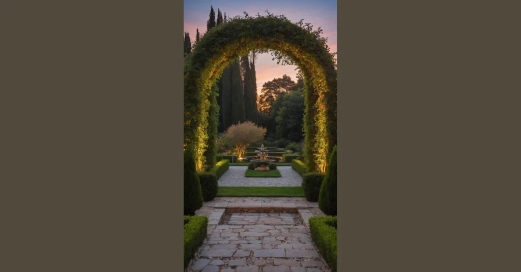 Forget your usual backyard; this garden is putting on a full-blown show! That leafy archway, all lit up like it’s ready for a major celebrity arrival, practically begs you to strut through. It’s like the red carpet entrance to a secret world where the flowers are probably holding their own fancy gala, maybe even debating who has the best bloom. You can almost hear the crickets humming a little theme song for your grand entrance into this magnificent (and probably very perfumed) flower garden.