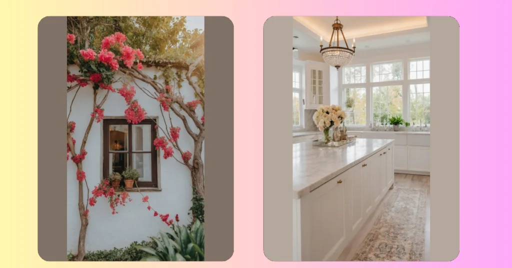 Then, just when you thought the house couldn’t get any prettier, BAM! These gorgeous pink, white, and peach flowers burst into the scene, practically winking at you from the foreground. They’re like the pop stars of the garden, demanding attention and making everything else look even better. Who needs a fancy painting when you can have this kind of vibrant home flower decor? These blooms are basically telling everyone, ‘Yep, this house knows how to live its best life,’ and they do it with a smile. They remind us that adding a splash of nature’s confetti can make your home feel like a permanent vacation spot, even if your biggest adventure today is finding matching socks.