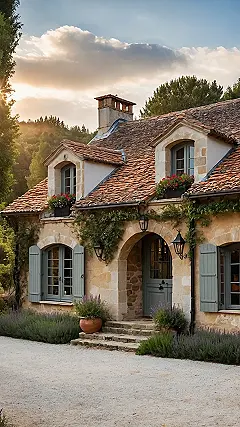 Forget about scrolling through endless feeds, take a look at this place! It’s basically the ultimate French cottage house goals, like it jumped straight out of a fancy movie set in the countryside. Check out those calm green shutters – they look like they’re ready to close for a very important afternoon nap. And that roof? Those reddish tiles probably have stories older than your grandparents, quietly judging everyone with their ancient tile wisdom. It’s got that perfect mix of looking super elegant and cozy, like it smells faintly of croissants and sunshine.