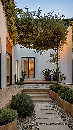 Just peek at the details here! That winding pebble path with stepping stones is like a secret invitation, leading you deeper into this mini-paradise without gobbling up too much room. And how cool is that little tree, perfectly cozy in its rock-lined bed, looking like the king of its tiny jungle? With all the different leafy plants and even that funky carved panel on the wall, it’s proof that a small space can have big personality. It’s basically a masterclass in making your outdoor nook so charming, you’ll forget you don’t have enough space for a full-on soccer field!