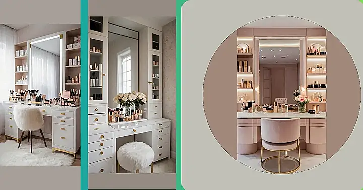 Walking into this makeup room is like stepping onto your own personal movie set, complete with all the glam! Those super bright, Hollywood-style lights around the mirror aren’t just for show; they’re like your secret weapon against bad lighting, making sure your eyeliner is always on point and your foundation blends seamlessly. No more trying to do your makeup in a dimly lit bathroom, squinting at your reflection! Plus, look at all that clever storage on the sides. Every lipstick, brush, and palette has its own cozy, organized spot, proving that even your makeup deserves a tidy home, unlike the mystery zone that is sometimes your locker.