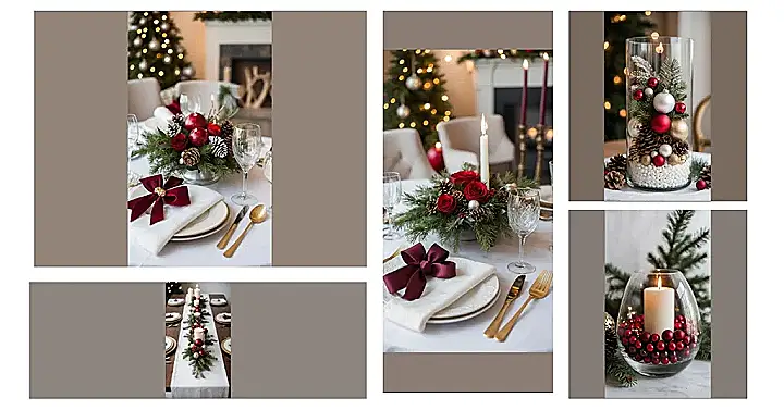 This holiday centerpiece isn’t just sitting there; it’s practically putting on a show! With those rich red roses looking all dramatic, surrounded by fresh evergreen branches that probably smell better than your grandma’s secret potpourri, it’s truly the star of the table. Add in some cute little pinecones and those sparkly silver ornaments, and you’ve got a setup so fabulous, it might just distract everyone from your aunt’s questionable casserole. Seriously, this centerpiece is so extra, it probably expects its own standing ovation before dinner even begins!