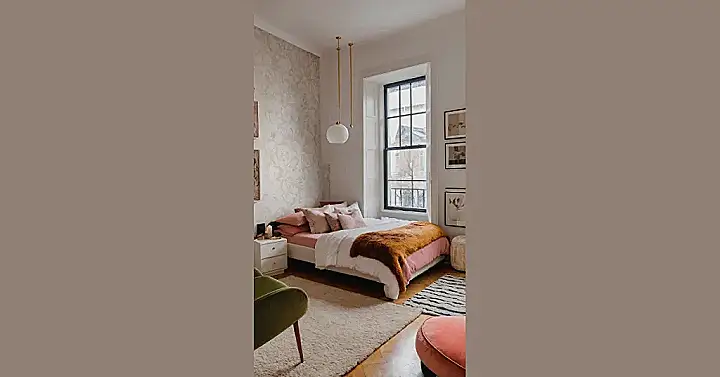 But don’t let all that “more” fool you into thinking it’s chaotic; this room has got a seriously cool, “moody” vibe going on, like it’s always ready for a cozy Netflix marathon, even during the day. That big, comfy bed with its stack of pillows and the super soft terracotta throw practically dares you to not take a nap. It’s got that chic, slightly dramatic feel, like a secret hideout that’s also totally Instagram-worthy. Who needs bright lights when you can have soft, inviting tones that make you feel like you’re wrapped in a stylish, giant hug?