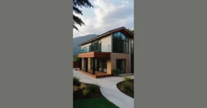 And talk about making an entrance! Those neat stone steps and perfectly manicured grass make you feel like you’re walking into a secret hideaway, not just a house. With all those warm, glowing lights around the doors and windows, this place looks ready for a friendly get-together or a super chill movie night – maybe even a slumber party where you don’t have to fight for the good spot on the couch. It’s like this little farmhouse design is saying, “Come on in, leave your drama at the door, and let’s just be cozy for a bit,” which, let’s be honest, is probably what we all need after a long day of, well, being a grade 9 student!