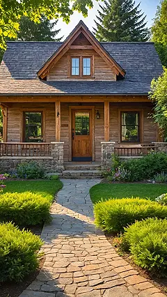That winding stone path, flanked by super green bushes, practically rolls out the welcome mat, leading you straight to a front door that just looks happy to see you. This farmhouse has serious main character energy, like it’s starring in its own peaceful movie. You can almost picture yourself skipping down that path, maybe to fetch the mail (or just some extra snacks from the kitchen). It’s got all the cozy feels of a country retreat but with enough style to make all your friends wish they had a place this cool for weekend hangouts. Who needs a mansion when you can have this slice of rustic paradise?