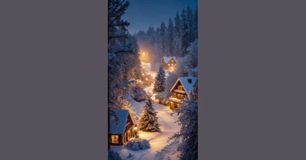And hold on, is that a snowman giving us a sly wink? He’s probably thinking, “Finally, some peace and quiet… and maybe someone will bring me a hat.” Surrounded by all that soft, glowing snow and the twinkling cabin lights, it’s the kind of scene that makes you want to grab a hot chocolate, crank up some chill tunes, and forget all about homework for a bit. This isn’t just a pretty image; it’s a mood board for ultimate winter relaxation, perfect for making your phone or computer screen feel as snug as a bug in a rug.