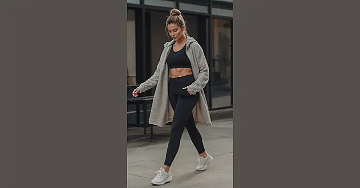 This woman clearly knows the secret to adulting: look effortlessly cool even if you’re just power-walking to get more snacks. Her active wear outfit, with the sleek grey leggings and comfy black hoodie, is basically the superhero uniform for a busy day. It’s perfect for crushing a gym session, then immediately looking put-together enough to convince everyone you’ve been incredibly productive all day, even if your biggest accomplishment was finally getting off the couch. It’s the kind of outfit that says, “I’m ready for anything,” whether that’s a yoga class or an intense Netflix marathon.