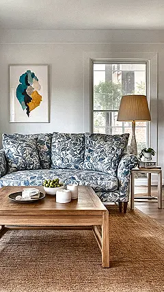 This living room is practically begging you to kick back and relax, isn’t it? That beautiful blue and white patterned sofa looks so inviting, you might just get lost in its leafy design – perfect for a game of “spot the hidden squirrel” or simply blending in for an epic nap. It really shows how clever home decorating can turn a regular room into your personal cozy escape. The abstract art above it adds a splash of cool colors, making the whole wall pop without trying too hard, like a good friend who always brings the fun.