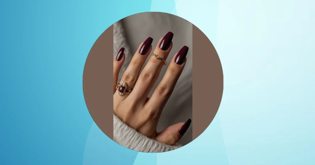 But wait, there’s more to this hand than just fabulous nails! Check out those sparkly rings – they’re practically throwing a party on her fingers. With the stunning maroon nails as the backdrop, those dazzling diamonds just pop even more, making the whole look super chic and a little bit glamorous. It’s like the nails said, “We’ll bring the sophisticated color,” and the rings said, “We’ll bring the bling!” Together, they prove that a great manicure isn’t just about the color, but how it works with your whole vibe, turning your hand into a tiny, stylish masterpiece.