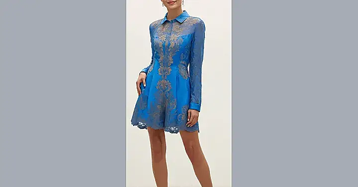 Now, let’s talk about those epic patterns and lacy details. This isn’t just any blue; it’s a blue masterpiece with intricate designs that make you feel like you just stepped off a runway, even if you’re just walking to your next class. The sheer lace on the sleeves and the playful hem add a touch of sparkle and fun, so you won’t just blend in. Get ready for compliments, because this dress is practically shouting, ‘Look at me! I’m fabulous and probably have a secret superpower!'”