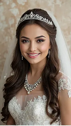 Peep this bride, looking absolutely flawless with her hair game stronger than your Wi-Fi signal on a good day! Her long, wavy locks are perfectly styled to frame that radiant smile, making every strand look like it just stepped out of a shampoo commercial. And that tiara? It’s not just a fancy headband; it’s a sparkly declaration that she’s officially upgraded from “future queen” to “queen of the day,” proving that a little bit of glam can turn anyone into royalty without needing a dragon to slay.
