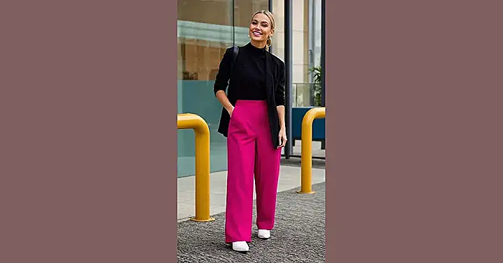 Forget blending into the crowd; this pink outfit is all about making a joyful, confident statement. With that sharp black blazer and sleek turtleneck keeping things super classy up top, the wide-leg pink pants are like a burst of pure energy – or maybe a giant, stylish bubblegum explosion – on a regular day. Plus, those comfy-looking trousers probably feel like the most fashionable PJs ever, meaning she’s winning at both style and comfort. It’s proof that sometimes, all you need is a pop of super-bright pink to turn a good day into a “I’m ready to conquer anything” kind of day!