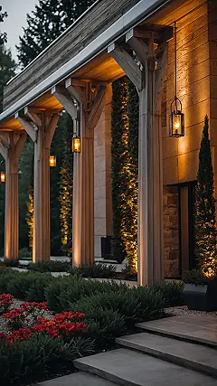And talk about making an entrance! The way those tall, slender trees are lit up from below, they’re practically posing for a photoshoot, saying “Move over, regular shrubs, we’re stars!” Plus, the uplighting on the wooden pillars adds such a warm, almost magical feel, like the whole building is giving you a giant, glowing hug. It’s pretty awesome how a few well-placed lights can turn a regular outdoor space into the kind of spot where you’d totally want to hang out, maybe even forgetting you have that science project due tomorrow.