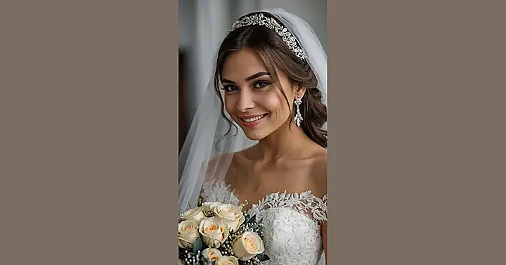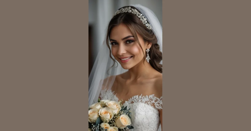 And check out that smile! She’s basically telling us, “Yep, I’m about to get married, and yes, my hair is this perfect without being stuck in a bun!” With her stunning tiara shimmering like a disco ball for a princess and those dreamy roses, her entire look is pure magic. Leaving her classy wedding hair down just adds to that easy-going, yet totally glamorous vibe, proving you can be super elegant without feeling like your head is glued to your neck.