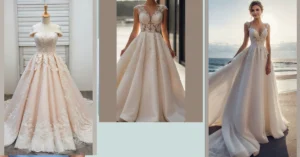 This dress is absolutely gorgeous, right? But hold up a sec – notice anything cool and different? It’s totally rocking a beautiful blush or champagne shade instead of the usual plain white! This proves that stepping outside the traditional white wedding dress box can be seriously amazing. Who wants to worry about spilling anything on pure white when you could be sparkling in something unique that shows off your personality? This dress is basically telling wedding traditions, “Thanks for the invite, but I’m bringing my own fabulous color to the party!”