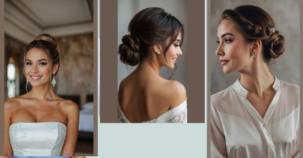 This kind of bun is a total MVP for any big day, especially a wedding. You won’t have to worry about your hair drooping halfway through the ceremony or getting tangled when you bust out your best moves on the dance floor. Plus, notice that super cute sparkly earring in the picture? A simple, clean bun like this lets cool accessories (and your own awesome neck and shoulders, showing off that snazzy dress strap!) really shine, instead of being hidden behind a waterfall of hair. It’s basically the smart choice for looking fabulous and staying comfy, so you can focus on the important stuff, like who gets the last slice of cake!