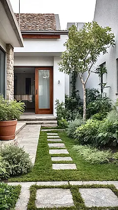 Who needs a confusing labyrinth when you’ve got a path this inviting? Those neat stepping stones leading up to the door make every entrance feel like a grand adventure, even if it’s just to grab a snack. This tiny garden is packed with personality, from the bushy green plants that look perfectly primped to the sleek wooden screen that probably hides all the secret garden gnomes (or maybe just the compost bin, who knows?). It’s the kind of outdoor space where you can relax without feeling overwhelmed, perfect for dreaming big dreams in a super stylish, small package. No getting lost here, just pure, concentrated garden goodness.