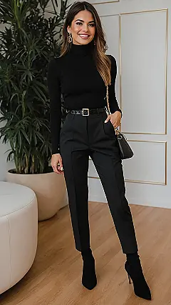 Holiday parties can be a total blast, but the eternal question of “what to wear?!” usually pops up before the first jingle bell. Fret no more, fashion detective! Take a peek at this superstar outfit. It’s all black, which means spills from Uncle Bob’s gravy are less of a catastrophe. The comfy turtleneck keeps you cozy when Aunt Carol insists on opening all the windows, and those snazzy pants let you move freely, whether you’re busting a move to Mariah Carey or stealthily snagging the last gingerbread cookie.