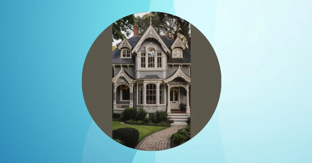 This stunning Victorian home looks like it stepped right out of a fancy storybook, ready for a grand tea party or perhaps a slightly dramatic reveal. Just look at those incredible details – the fancy carvings on the gable, the charming porch with its intricate ironwork, and all those different textures! It’s the kind of house where you’d half expect a kindly (or slightly quirky) old wizard to answer the door, or maybe a secret passageway hidden behind a bookshelf. Forget plain walls; this place is rocking moody blues and greys, making it look both super cool and just a *little* bit mysterious, like it’s holding all the best gossip from centuries ago.
