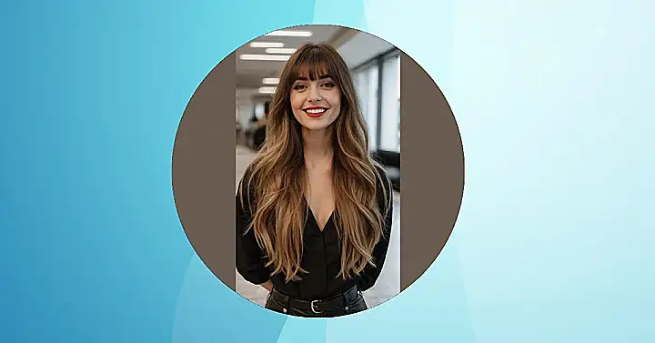 These aren’t just any bangs; they’re the kind that elegantly part down the middle, like a velvet curtain opening for a show-stopping performance (which is your face, obviously!). They work like magic with long hair, just like our smiling friend here shows off, adding a touch of effortless cool without feeling too heavy or in-your-face. Plus, if you ever decide you want to switch up your look, they grow out super gracefully, blending into your layers without that awkward ‘half-bangs, half-forehead’ phase. It’s basically the hairstyle equivalent of having your cake and eating it too, looking fabulous the whole time!
