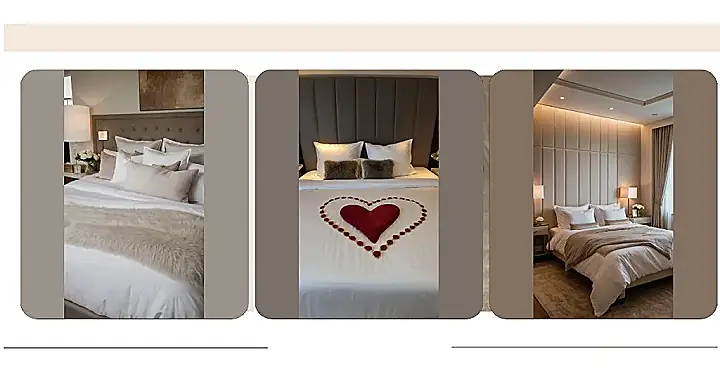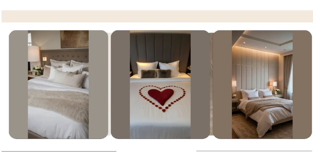 You know, this setup looks so grand, it almost makes you wonder what you’re even supposed to do with it. Do you just stare at the heart decor all night? Or do you carefully tiptoe around it when you get into bed, trying not to mess up the perfect arrangement? It’s like a masterpiece you don’t want to disturb! And those fuzzy pillows? They look like they’re ready for some serious cozy lounging after all the “oohing and aahing” over the romantic gestures. It’s pretty clear this bedroom wants you to feel like royalty, or at least like someone who deserves a really cool, heart-decorated snooze.