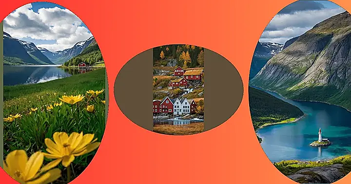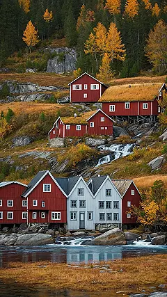 Beyond the super cool houses, this whole scene is basically Mother Nature showing off her artistic side, making it a dream for Norway landscape photography. The trees are rocking their best golden and orange outfits for autumn, making the green pines look a little jealous in the background. Then there’s that sparkling waterfall, tumbling down the rocks like a giant, happy dog running down a hill – it adds the perfect soundtrack to this epic view. You can almost feel the fresh, crisp air and hear the water rushing by. Who needs fancy filters when Norway’s landscape already looks this amazing in real life?