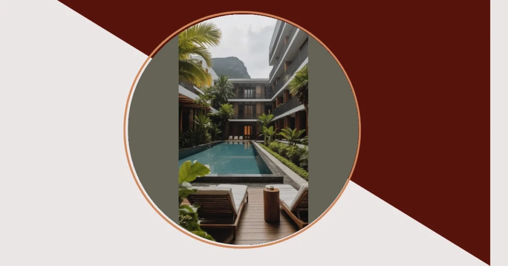 And don’t even get us started on the scenery! Those lush, leafy plants aren’t just for decoration; they’re practically your personal security guards, making sure no real-world problems can sneak into your zen zone. With that majestic mountain peeking over the buildings like a friendly giant, this tropical paradise is definitely giving “I woke up like this, surrounded by nature and luxury” vibes. It’s the kind of place where even the plants look like they’re having a better time than you do on a Monday morning. Who needs a screensaver when you could be lounging by this pool, soaking up all the good times a tropical hotel has to offer?