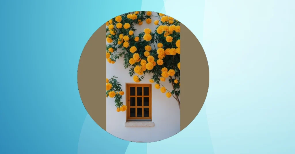 Look at this place! It’s like the house decided to throw a massive, cheerful party, and the guest of honor is a cascade of bright yellow flowers. They’re climbing up the pristine white wall like they’re trying to give the entire home a vibrant, sunny hug. That wooden window isn’t just a window anymore; it’s framed by a fluffy yellow explosion, almost as if the flowers are playfully peeking inside, wondering what’s for dinner. It’s definitely an A+ for home flower decor, making the whole building look like it’s perpetually happy and ready for a photoshoot.