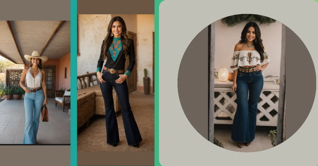 Those wide-leg jeans look so comfortable, you could probably do a TikTok dance-off or even, dare we say, actually ride a horse (a really chill one, though!) without feeling restricted. Paired with those sharp boots and that stunning necklace, this look perfectly blends traditional charm with modern-day coolness. It’s the kind of outfit that says, “I’m ready for adventure, but also ready for a selfie,” making it a perfect example of how awesome Mexican rancho outfits can be for anyone who loves fashion with a friendly, vibrant twist.